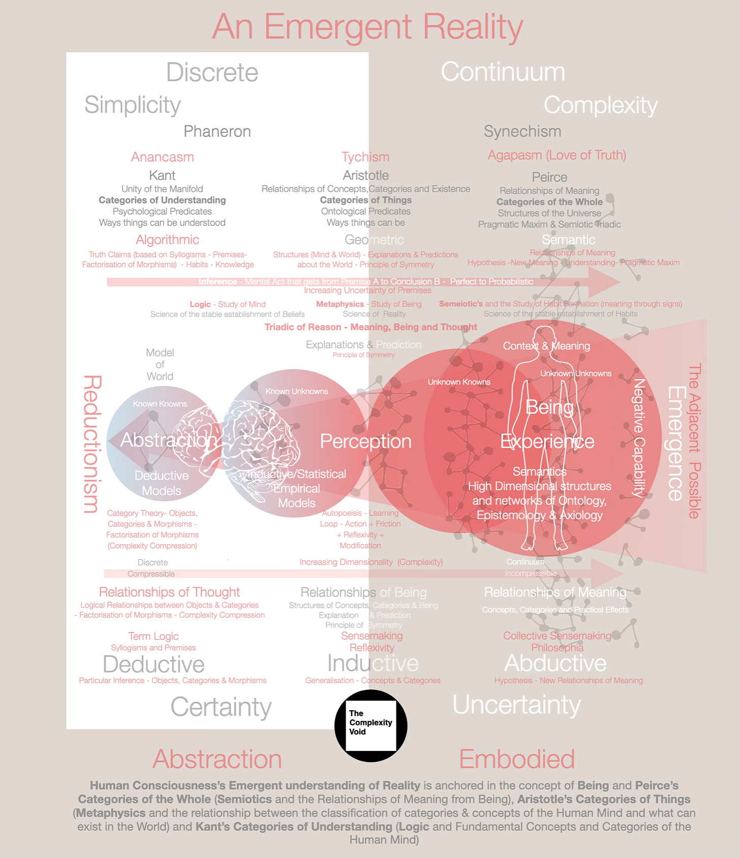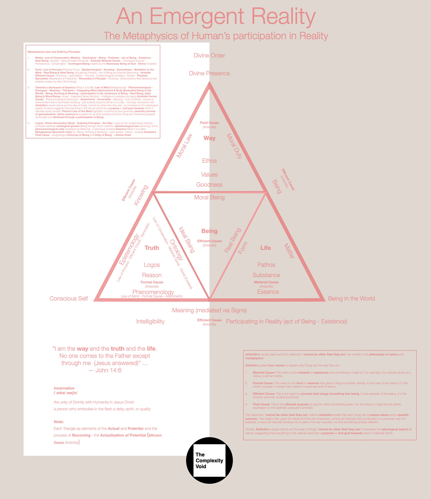 The schematic below highlights how our understanding of Reality can move from materialistic forces - Cause & Effect, Determinism, and Reductionism [LINK] - the three core Axioms of the Scientific Revolution [LINK] - to higher-order emergent transcendent metaphysical principles and objective values (i.e. a revival in Realism - Normative Sciences: Truth, Beauty (Aesthetics) and Justice (Ethics)) anchored in the Ontology of Being (Aristotle’s Categories), the Epistemology of Knowing (Kant’s Categories) and the Phenomenology of Meaning (Peirce Categories) to better understand the nature of intelligibility and the entangled relationships between the Metaphysical & Physical, the Temporal & Eternal, the Finite & Infinite and Abstraction & our embodied Being in the World.