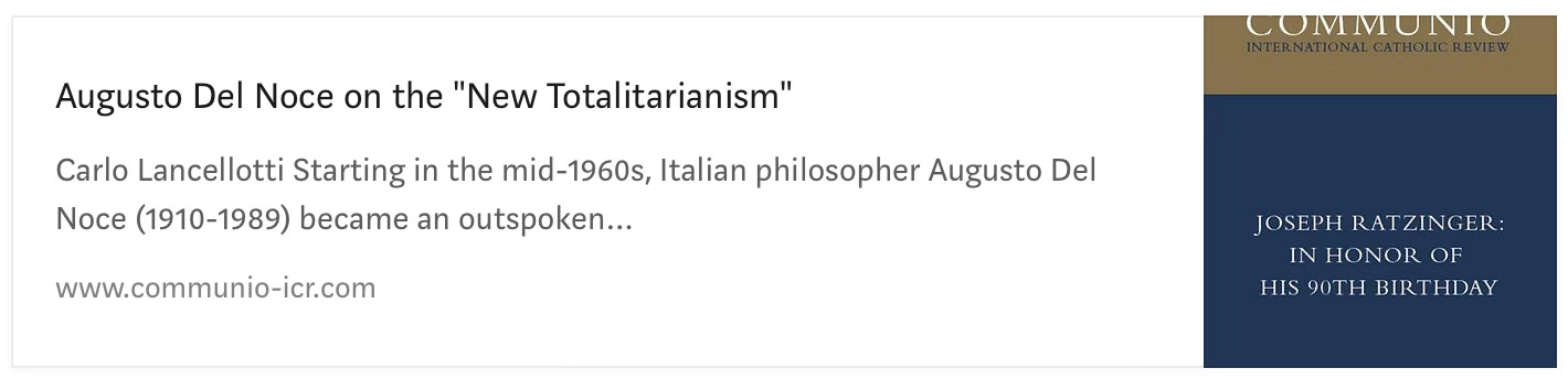 “According to Del Noce, the telltale sign of totalitarianism, which he had observed firsthand as a young man in the 1930s and 40s, is the “