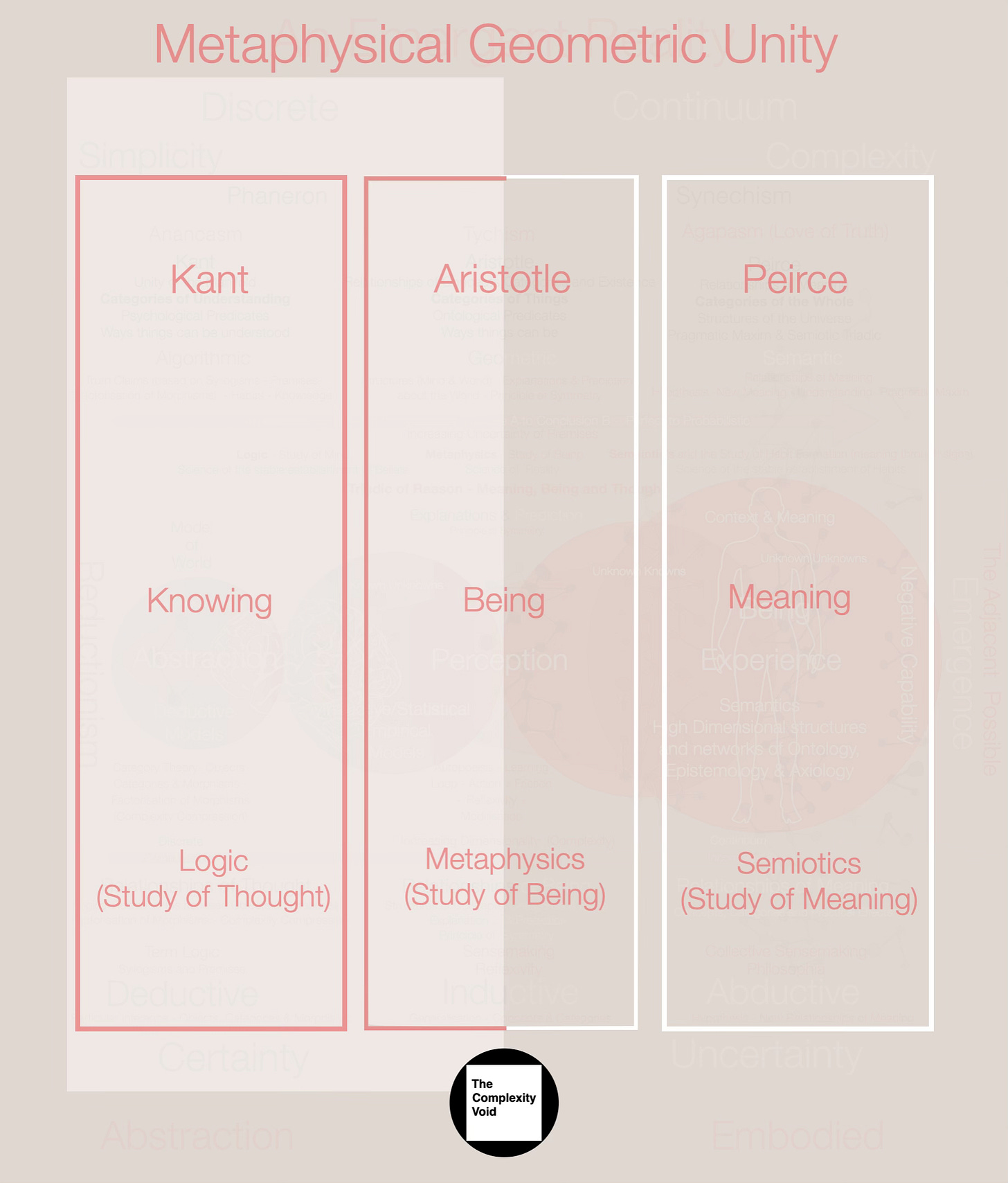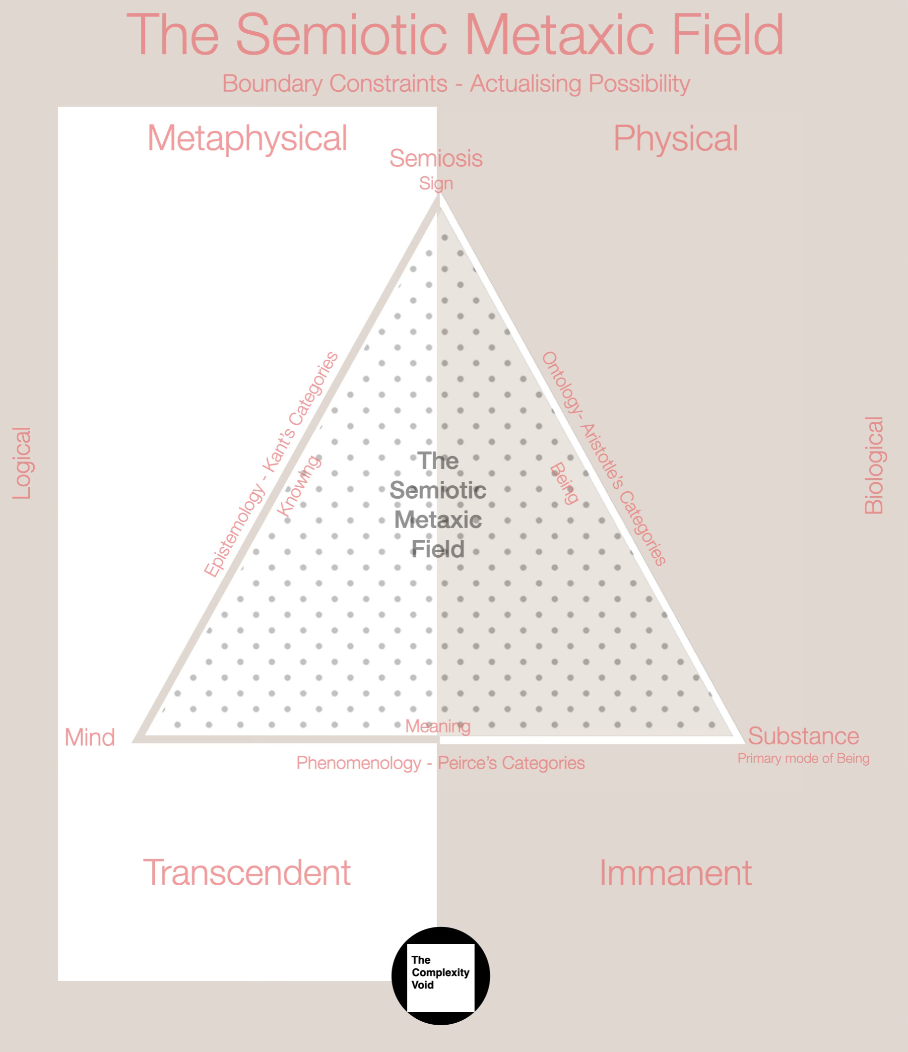 The Semiotic Metaxic Field - Intelligent Contingent Being: Categories as Boundary Constraints explored the role of Aristotle’s Ontological, Kant’s Epistemological and Peirce Phenomenological categories that establish boundary constraints to Human’s understanding of the infinite horizon of the possibility of Reality grounded in Being.