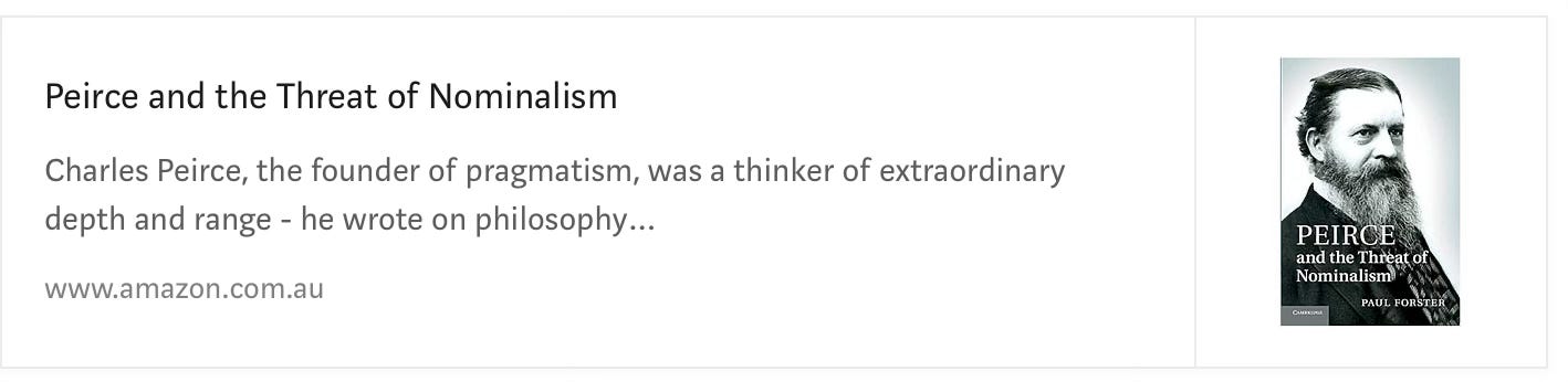 “In short, there was a tidal wave of nominalism.Descartes was a nominalist. Locke and all his following, Berkley, Hartley, Hume, and even Reid, were nominalists. Leibniz was an extreme nominalist, and Remusat who has lately made an attempt to repair the edifice of Liebnizian monadology, does so by cutting away every part which leans at all towards realism. Kant was a nominalist; although his philosophy would have rendered compacter, more consistent, and stronger if its author had taken up realism, as he certainly would have done if he read Scotus. Hegel was a nominalist of realistic yearnings; I might continue the list much further,Thus, in one word, all modern philosophy of every sect has been nominalistic”…