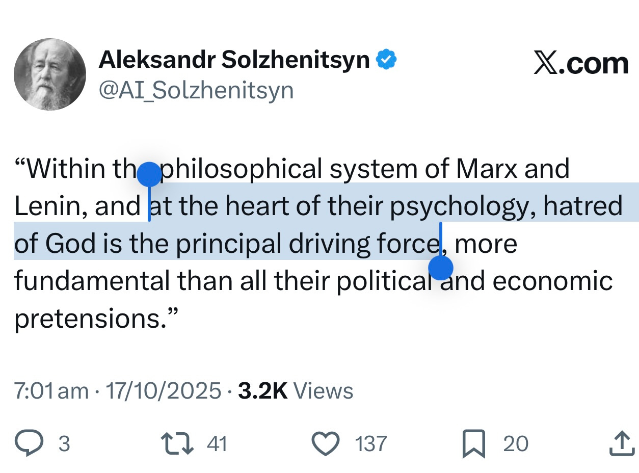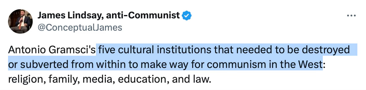 “The civilised world has been thoroughly saturated with Christianity for 2000 years.Any country grounded in Judeo-Christian values cannot be overthrown until those roots are cut. But to cut the roots — to change culture — a long march through the institutions is necessary”…