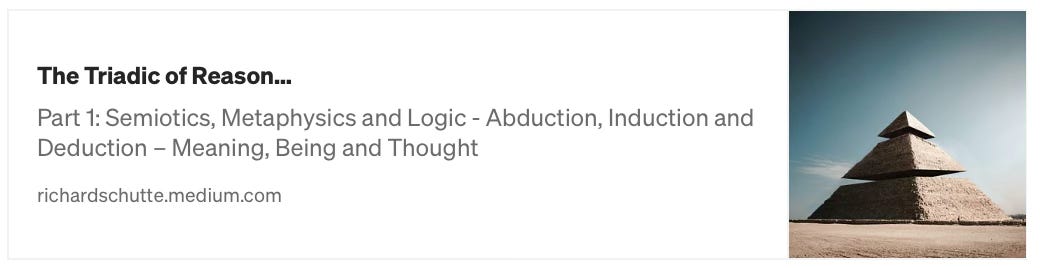 The Semiotic Triadic, Pragmatic Maxim and the addition of Abduction to the nature of Reason ( alongside Aristotle’s Deductive Reasoning and Sir Francis Bacon’s Inductive Reason ) bridges the Cartesian Dualism and the schism that had opened up between our Minds and our Body.