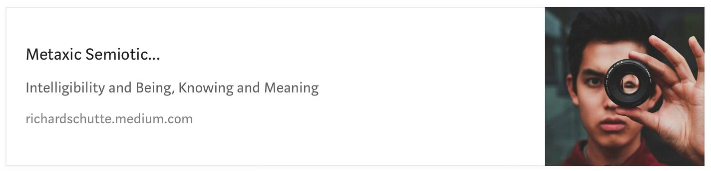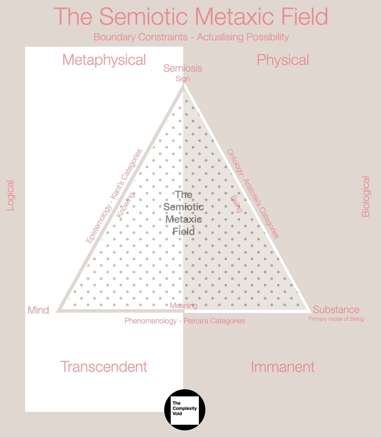 In doing so, the possibility of what does it mean and the intelligibility of Reality (i.e. Semiotics of Life) collapses (via the Semiotic Triadic & Pragmatic Maxim) from the infinite (extreme Dogma) or nothing (extreme Skepticism ) to a semiosis mediated by Man’s embodied phenomenological participation in Reality via Peirce’s Categories and modes of Being. In doing so, it provides a third Boundary Constraint to the Semiotic Metaxic Field.