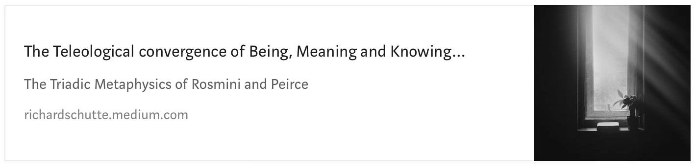 Whereas material substance makes an object physically real ( Real Being - Rosmini), the triadic categories of Meaning-Being–Knowing make a phenomenon intelligibly real (Ideal Being - Rosmini).